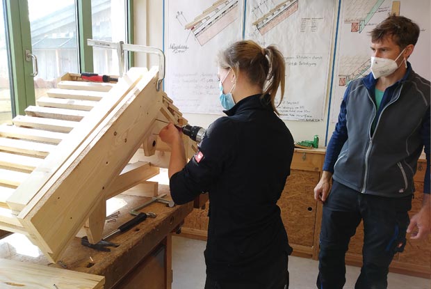 Mittlerweile ist sie wieder zurück an der Berufsschule – dort ging es zum Beispiel um den Treppenbau: „Wir haben uns mit der Schrittmaßregel, Auftritt und der Steigung auseinandergesetzt und gelernt, aus welchen Holzarten man eine Treppe herstellen kann. Das sind zum Beispiel Kiefer, Buche, Eiche und Lärche.“