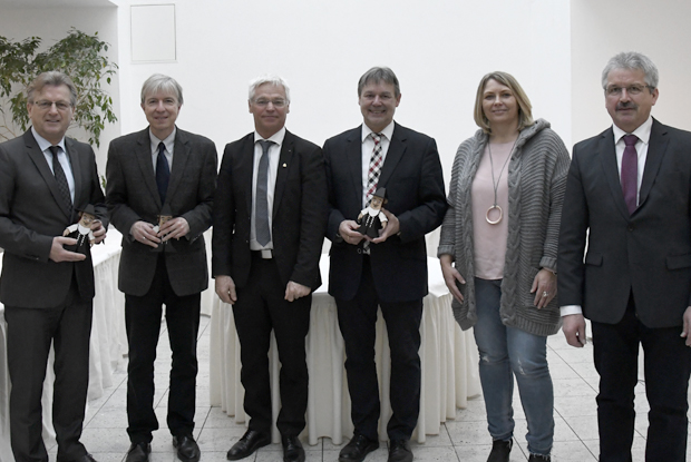 Bürgermeister Rainer Detsch, stv. Regierungspräsident Thomas Engel (v.l.) und stv. Landrat Gerhard Wunder (4.v.l.) erhielten ihre Timmys von LIV-Präsident Peter Aicher (3.v.l.), Tanja Hermsdörfer und Bezirksvorsitzendem Manfred Amon.