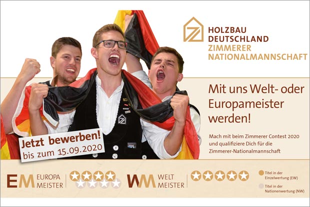 Wer Weltmeister werden will, ist hier richtig: Der Zimmerer Contest 2020 ist der erste Schritt auf dem Weg zum Titel. Denn dabei wird entschieden, wer Ende des Jahres in das neue Team der Zimmerer-Nationalmannschaft aufgenommen wird.